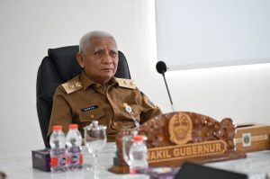 Wakil Gubernur Sumatera Utara (Wagubsu) H. Surya saat mengikuti Rapat Koordinasi (Rakor) Pengendalian Inflasi Daerah yang dipimpin Menteri Keuangan (Menkeu) RI Purbaya Yudhi Sadewa secara virtual dari Kantor Gubernur Sumut Jalan Pangeran Diponegoro 30 Medan, Senin (20/10/2025).